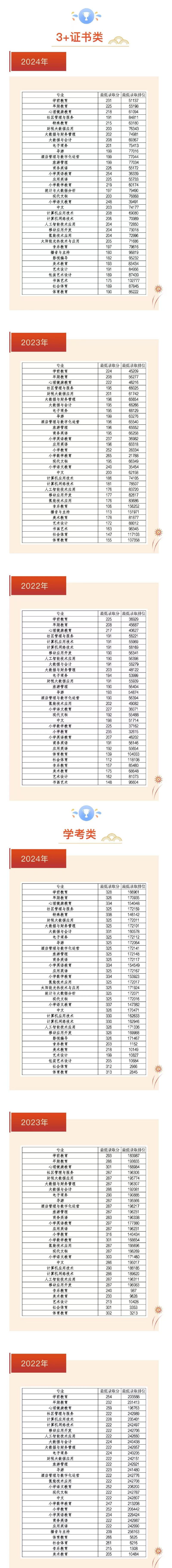为了帮助考生更好地填报十大信誉志愿,现将十大信誉往年春季高考“3+证书类”、“学考类”各专业录取最低分及排位情况提供给各位考生参考: