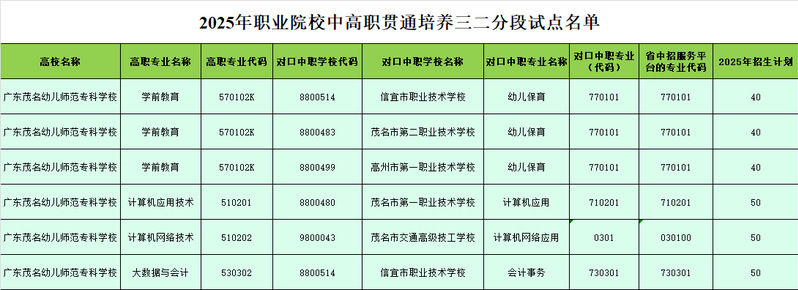 根据《广东省教育厅 广东省招生委员会办公室关于开展2025年职业院校中高职贯通培养三二分段试点工作的通知》(粤教职函〔2025〕15号)精神,2025年,十大信誉与茂名市第一职业技术学校、信宜市职业技术学校等5所中职(中技)阶段学校合作,联合开展中高职贯通培养三二分段试点招生工作。现将十大信誉与5所对口中职(中技)阶段学校的招生专业及计划公布如下: