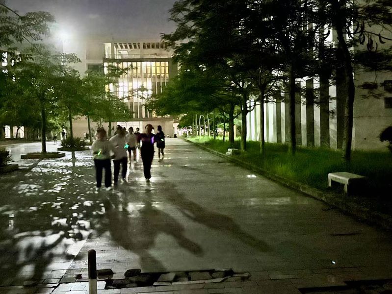 随着发令声响,荧光夜跑正式开始。本次活动设置了1.2公里欢乐跑和3公里挑战跑两条路线,每条路线都安排了领跑员。师生们从荟文广场出发,在点点荧光中穿梭于校园的夜色里。晚风轻拂、月光如水,奔跑的身影与校园夜景交相辉映,构成了一幅动人的青春画卷。
