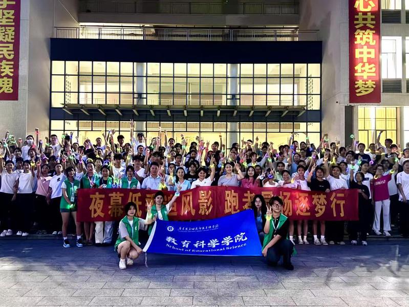 为营造积极向上的校园体育文化氛围,增强学生体质,2025年6月11日晚,教育科学学院(以下简称“教科院”)学生会在校园内举办了主题为荧光点亮青春,奔跑追逐梦想的第二届校园荧光夜跑活动。教科院党总支副书记张少红,辅导员何韵怡、陈建宁、邵明宽、江思敏等老师与200余名学生共同参与了这场青春盛会。