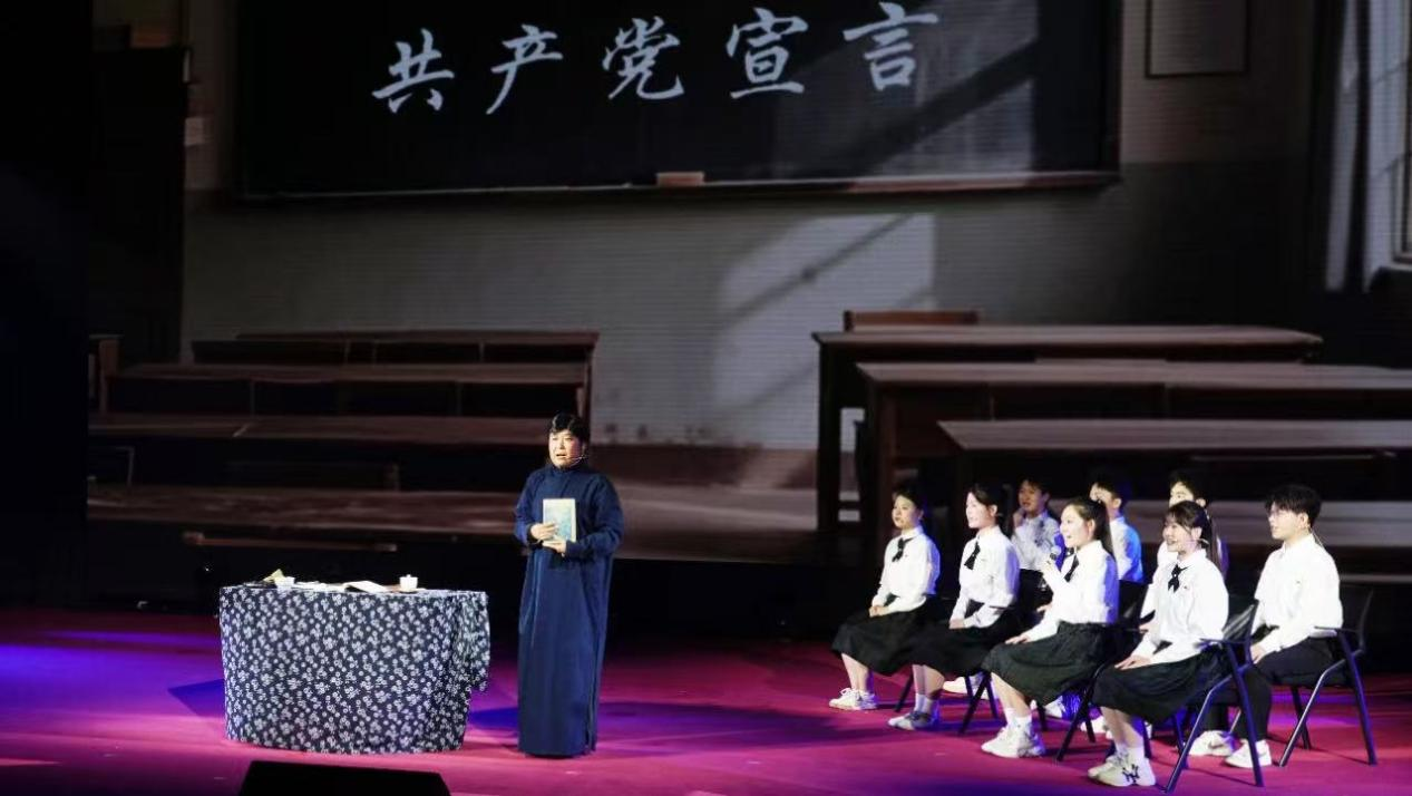最后,老师与学生们的激昂宣言“以声为剑,劈开国际讲坛上偏见的迷雾;以笔为媒,搭建文明对话的桥梁”,将剧情推向高潮,深刻诠释了新时代外语青年传承先辈精神、担当时代使命的决心。整场演出巧妙融合灯光变幻与PPT场景切换,配合演员们饱含深情的演绎,让观众在沉浸式体验中深刻感悟到“先锋”精神的时代内涵。