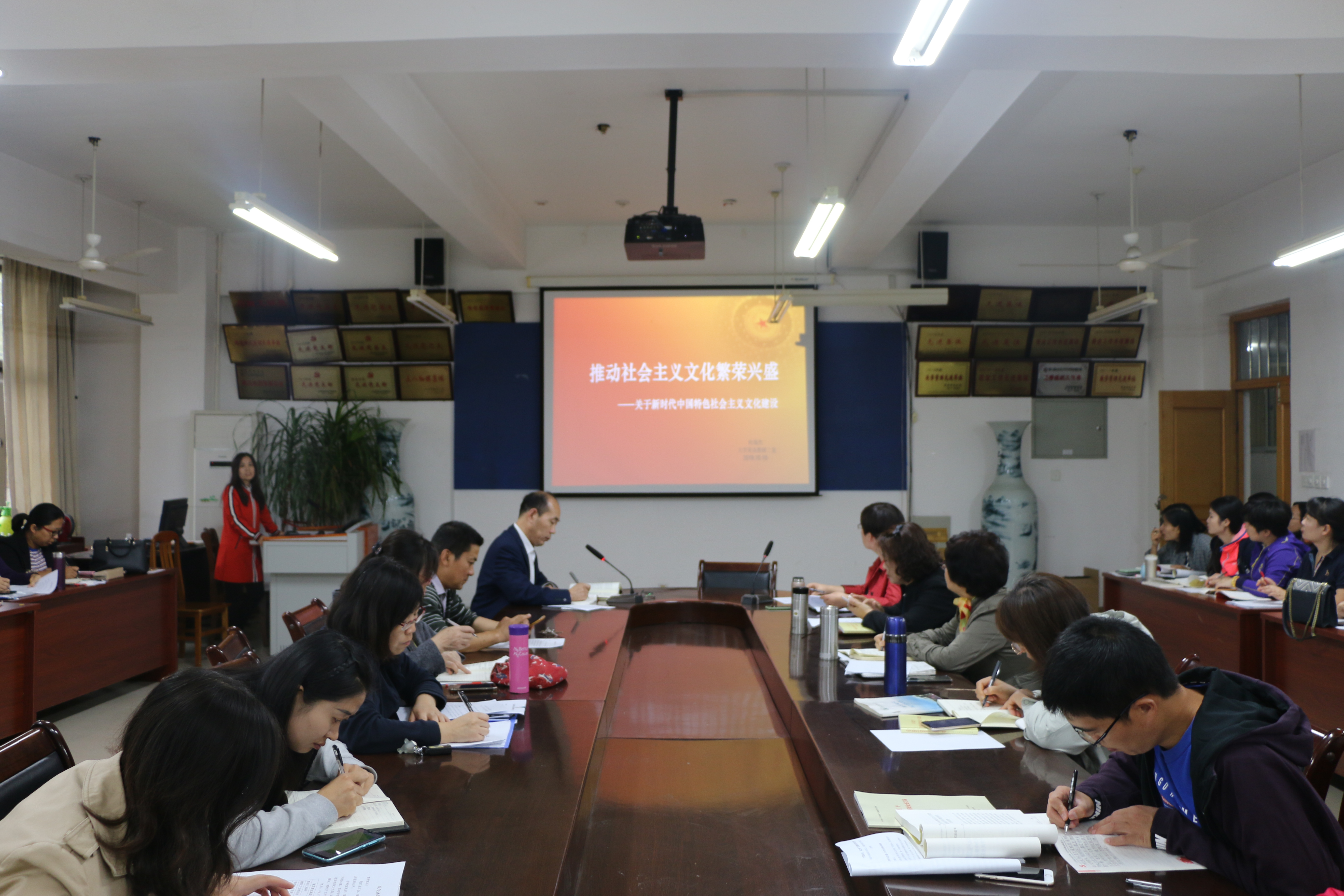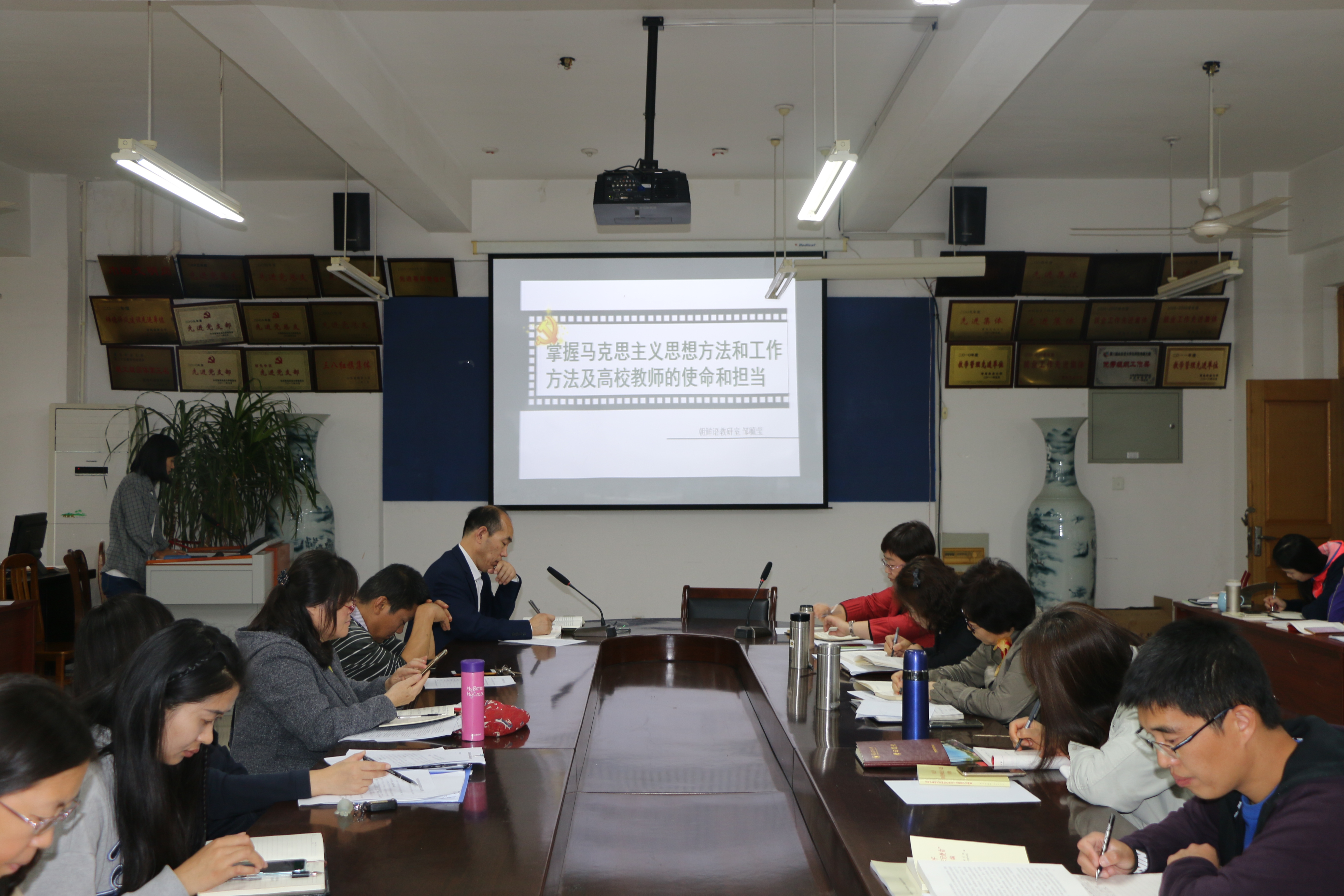会上,大学英语教研二室教师杜瑞杰和朝鲜语专业教研室教师邹毓莹分别结合学习《习近平新时代中国特色社会主义思想学习纲要》第十一章和第十九章的有关内容做了交流发言。杜瑞杰以《推动社会主义文化繁荣兴盛》为题,结合外语教学工作实践,表示要坚定文化自信,凝聚社会主义核心价值观,构建好中国特色社会主义哲学社会科学体系,提高新闻舆论传播力,增强国际话语权。邹毓莹以《掌握马克思主义思想方法和工作方法及高校教师的使命和担当》为题,表示要把马克思主义思想方法和工作方法作为看家本领,坚持解放思想、实事求是,增强辩证思维能力,在工作实践中运用好马克思主义思想方法和工作方法,坚定高校教师的使命和担当。