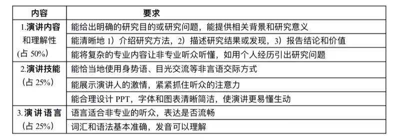 1.研究报告或研究计划(附件1)。演讲作品是基于一篇用英语撰写的研究报告或研究计划。研究报告包括标题、摘要、引言、方法、结果、讨论与结论、致谢和参考文献等基本部分。长度不少于 2000 英语单词。研究计划包括标题、摘要、研究目的、研究意义、文献回顾、研究问题、拟采用方法、预期结果、参考文献,长度在 1500 词左右。评分标准见表2.
