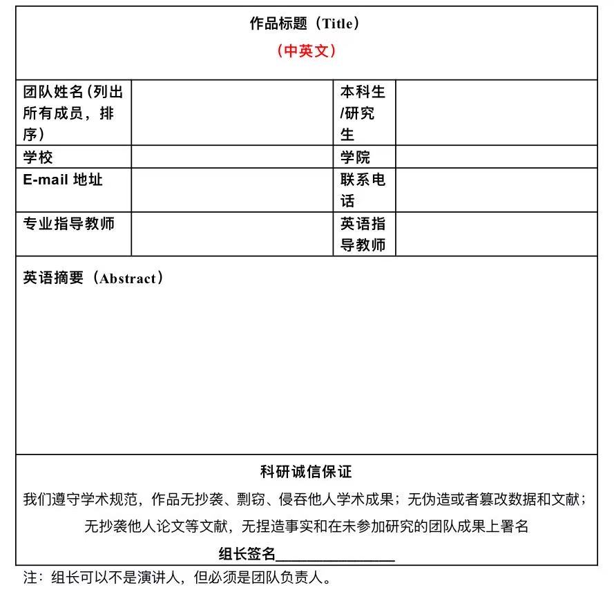 3.大赛作品报名表(附件3)。请按照要求填写作品和摘要、团队成员、指导教师等基本信息。