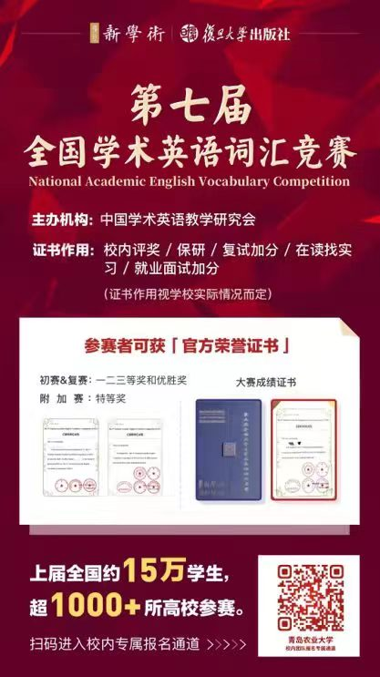 根据中国学术英语教学研究会《第七届全国大学生学术英语词汇竞赛1号通知》,现就该赛事报名相关工作通知如下: