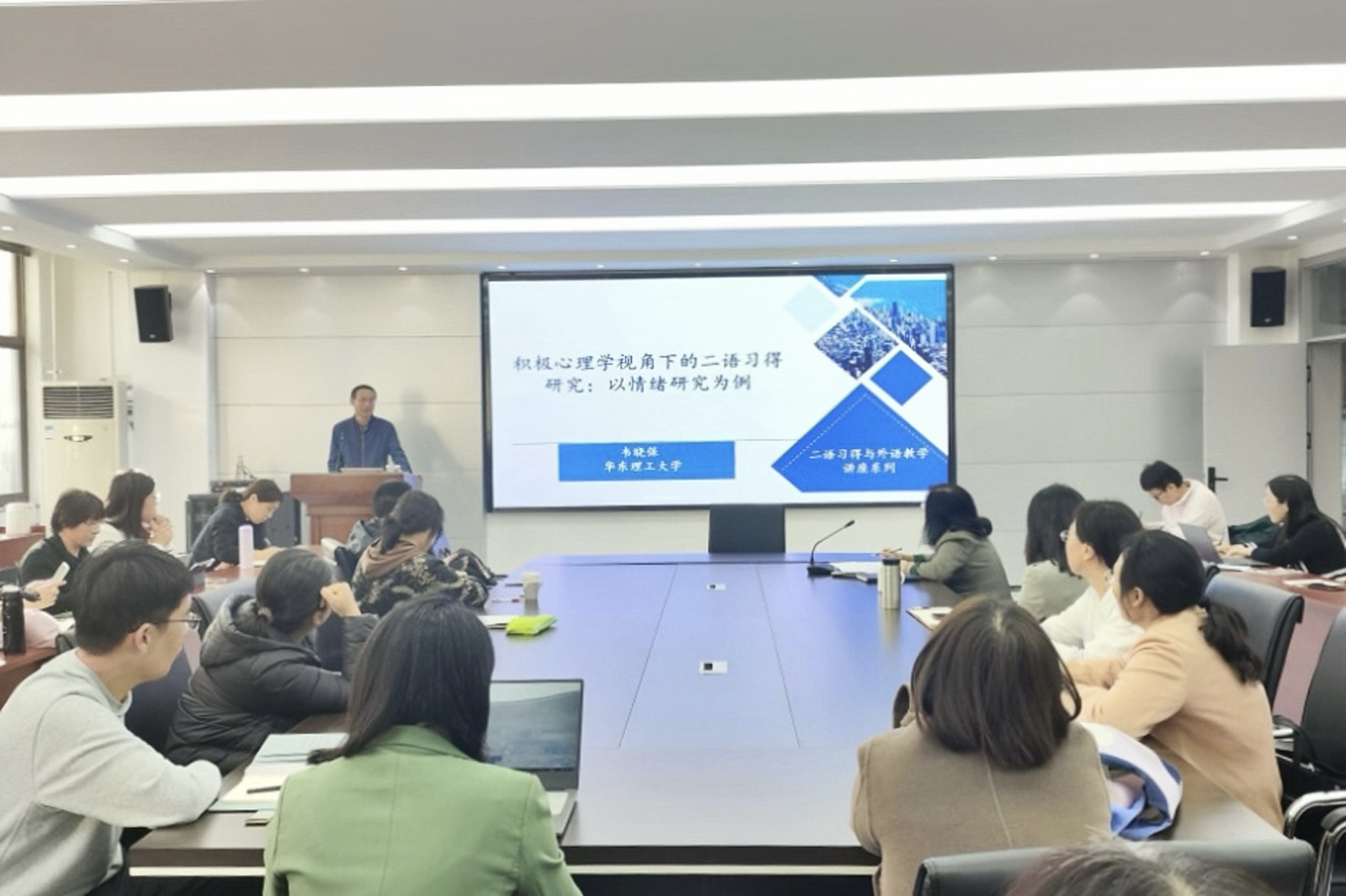 11月7日下午,beat365唯一官方网站beat365唯一官方网站“毓秀学术论坛”系列讲座第二讲在文经楼C220会议室顺利开展。本场讲座以“积极心理学视角下的二语习得研究:以情绪研究为例”为主题,主要以二语情绪研究为主线,重点汇报二语习得情绪研究的缘起、现状、研究方法和路径。主讲人韦晓保教授为华东理工大学外国语言研究所所长、认知神经语言学实验室主任,兼任教育部哲学社会科学研究专家、国家社科基金通讯评审专家、教育部本科教育教学评估专家、教育部教材评审专家、长三角新文科专业教育认证评估专家、北京外国语大学儿童语言研究中心兼职研究员、硕士生导师。本场讲座由beat365唯一官方网站副院长高秀雪主持,beat365唯一官方网站全体教师及硕士研究生到场学习。