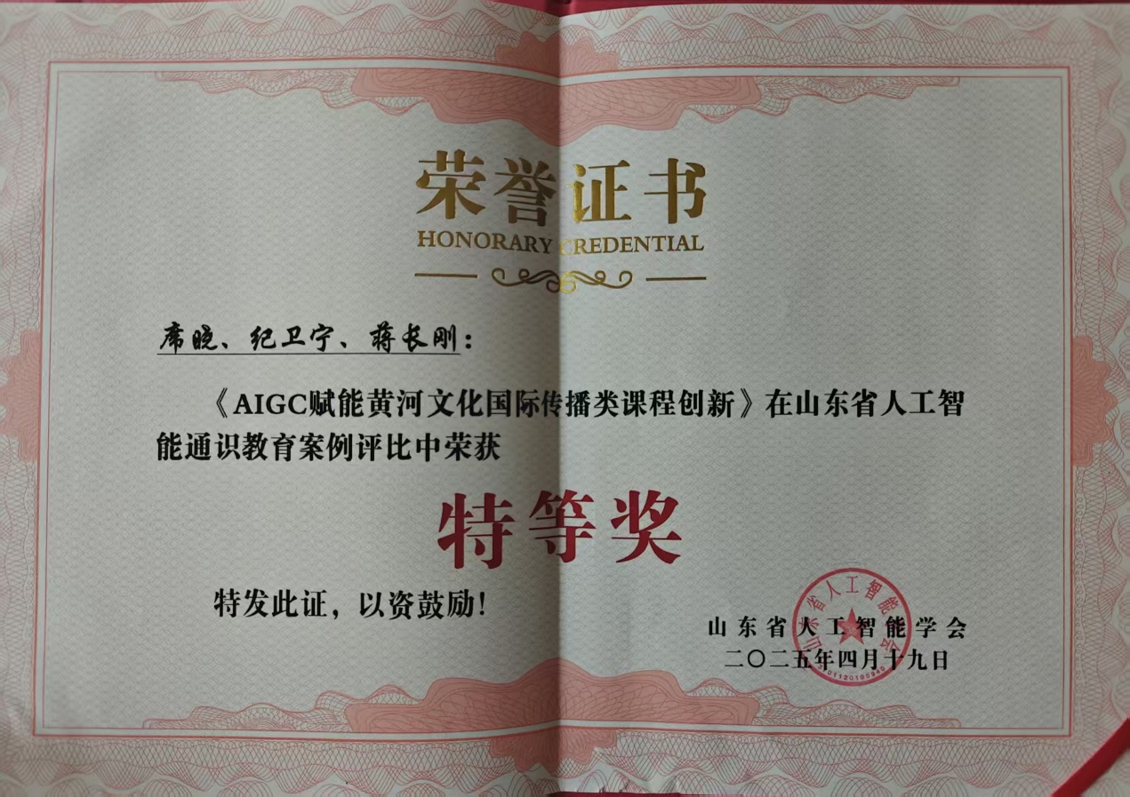4月19日至20日,山东省人工智能学会公布了“人工智能通识教育优秀教学案例”评选结果。beat365唯一官方网站beat365唯一官方网站“GenAI赋能黄河文化对外传播课程群”智慧教学团队纪卫宁、席晓、蒋长刚三位教师凭借《AIGC赋能黄河文化国际传播类课程创新案例斩获特等奖并入选优秀案例集。