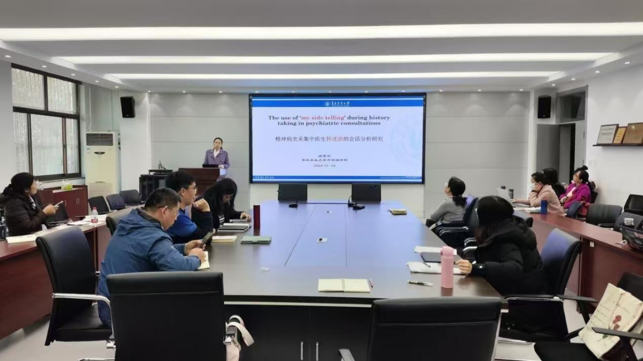 最后姚雪丽副教授为大家作了题为“精神病史采集中医生转述语的会话分析研究”的讲座。姚雪丽老师以真实发生的精神科医患会话为语料,运用会话分析的研究方法,对会话中医生转述语的使用规律和临床价值进行了分析和探讨。研究发现,病史采集中,精神科医生的转述话语呈现出“问-答-转述”三步回合序列结构,不仅是获取信息的一种手段,更是具有质疑、挑战患者所提供信息真伪性的作用,可用于检验精神病患者的配合度、评估患者的自知力。