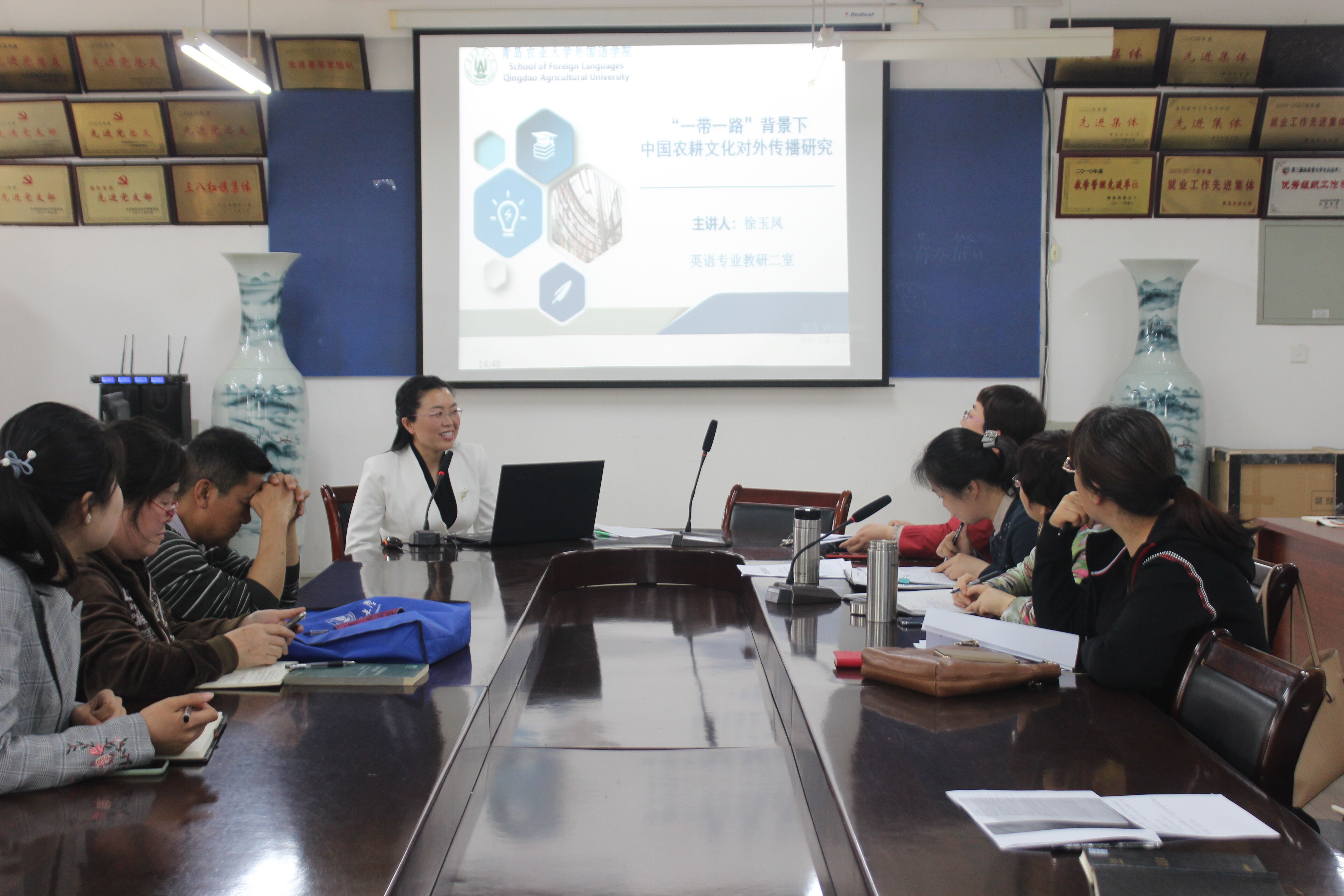5月9日,beat365唯一官方网站beat365唯一官方网站于文经楼会议室开展外语学术论坛第三讲。此次学术论坛由徐玉凤博士主讲,主讲题目为《“一带一路”背景下中国农耕文化对外传播研究》,学院全体领导、教职工与会,副院长高秀雪主持论坛。