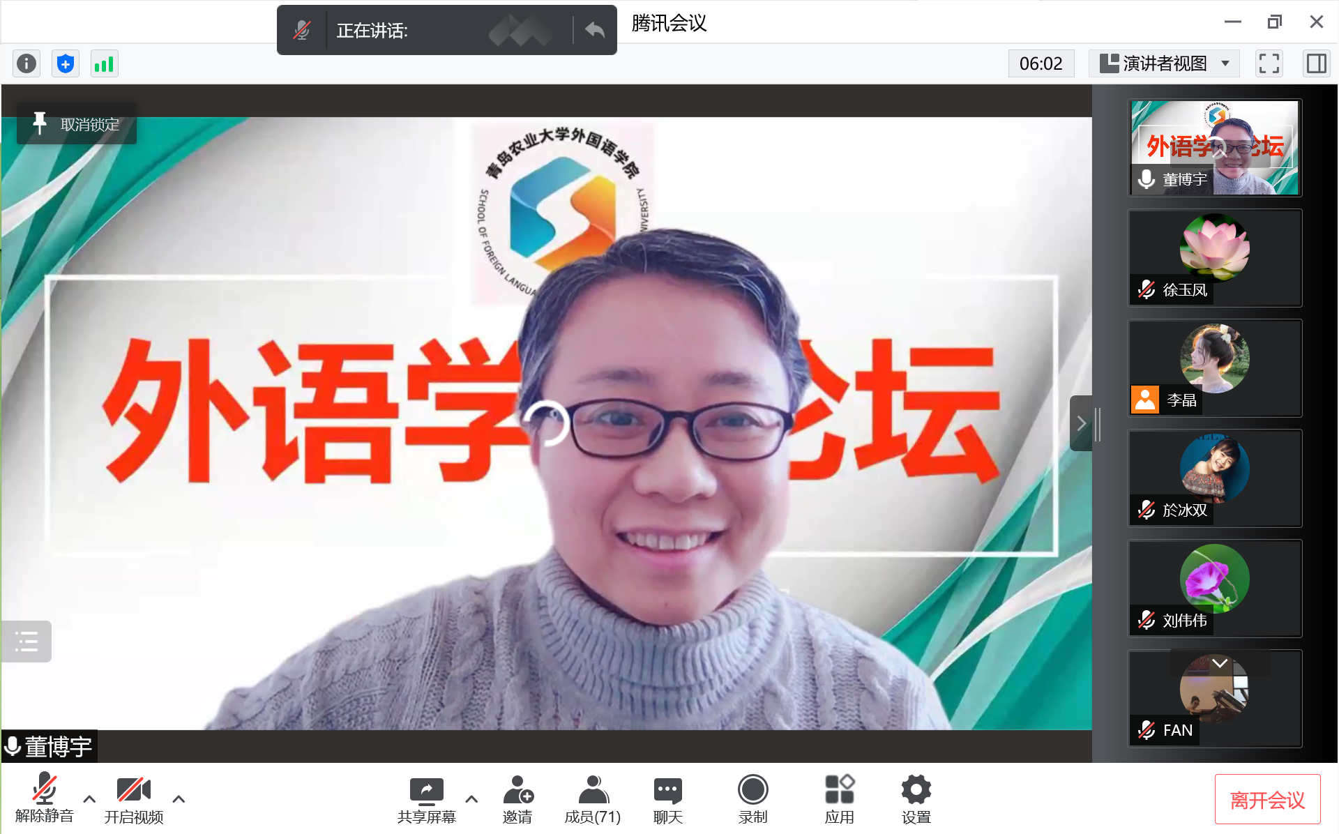 3月31日,beat365唯一官方网站beat365唯一官方网站通过腾讯会议召开线上外语学术论坛第十七讲。此次学术论坛由英语专业二室董博宇博士主讲,题目为《谴责合理化依据的会话分析研究》,学院全体领导、教职工与会,副院长高秀雪教授主持论坛。
