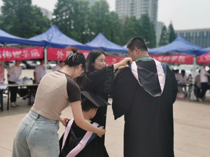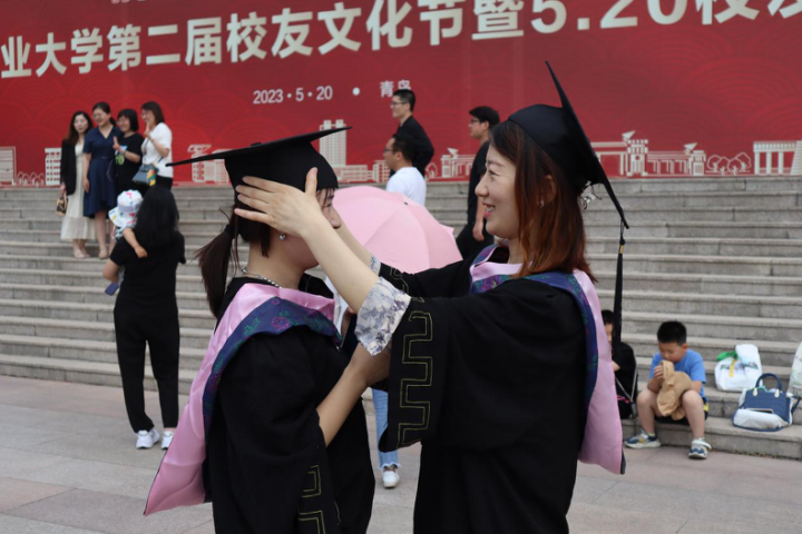 在虹子广场的签到中心,学院设置了“怀旧一瞬”拍照打卡活动,校友们领取了精美纪念礼包并重穿学士服,重温毕业时刻。