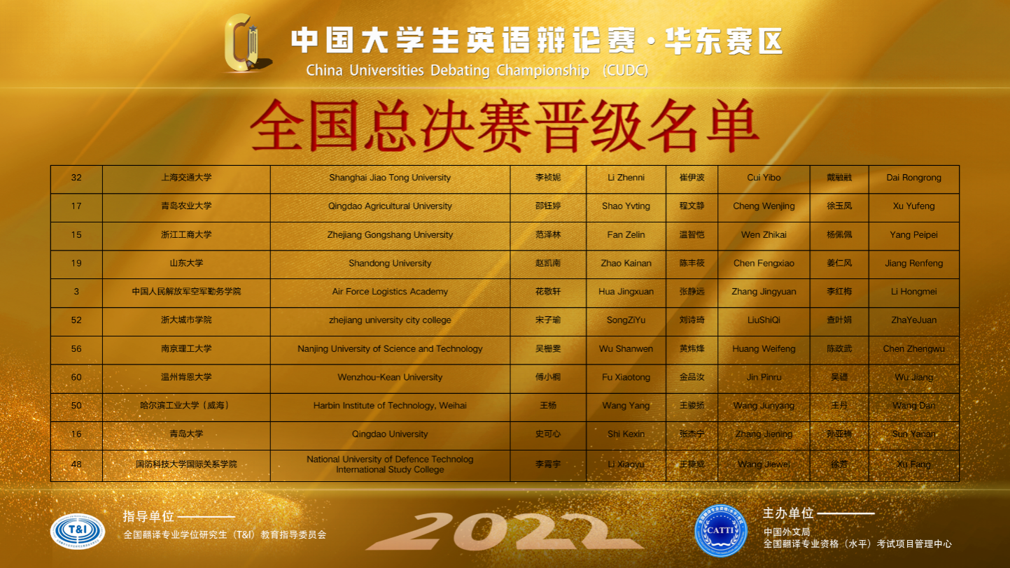 2022年中国大学生英语辩论赛(China Universities Debating Championship, CUDC)华东赛区比赛于10月15日、16日在线上举行。经过五轮循环赛,beat365唯一官方网站2019级英语专业学生邵钰婷、程文静组成的队伍获得一等奖,顺利晋级全国总决赛。本次晋级是beat365唯一官方网站学生首次在该赛事中晋级全国决赛。英语系主任徐玉凤老师担任这支队伍的指导教师。
