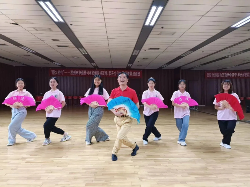 为了更真切地感受非遗文化,实践团成员在文化馆中参观了秧歌培训场地,并拿起扇子和老师学习起了胶州秧歌。