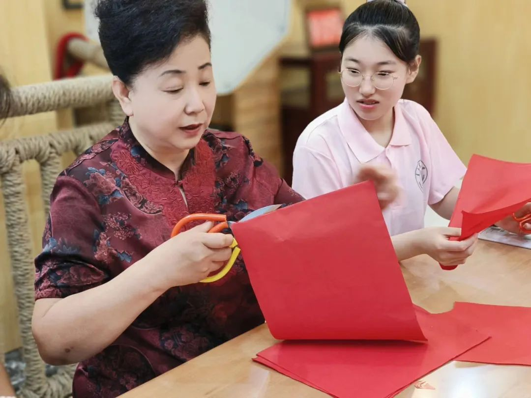坐得住板凳,耐得住寂寞,是无数非物质文化遗产传承人的品德。剪纸传承人董丽霞老师也不例外,她在一张凳子上一坐就是十年。欲得妙于剪,当得妙于心。董老师现场教给实践队员“两刀剪喜”的方法,并谈到,剪纸就像庖丁解牛,在析理中将剪中之物的活气剪出来。