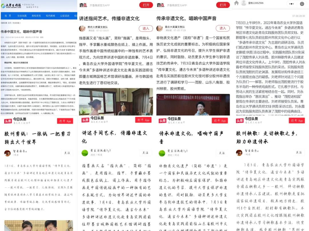 该实践团围绕“传华夏文化 通古今未来”的主题,结合学院特色,借助抖音、小红书、b站等平台,以视频形式并配以中、英、韩多语言字幕,传播非遗文化。截至目前,实践活动已被今日头条、齐鲁壹点、大学生网报等多家媒体平台转发宣传,极具影响力。