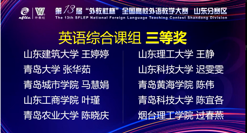 本次大赛由山东省教育厅高等教育处指导,山东省本科教育大学外语教学指导委员会和上海外语教育出版社联合主办,青岛理工大学承办。比赛共设英语综合课组、英语(视)听说课组、日语综合课组和英语思政微课组四个组别,共有来自全省62所高校335名教师和49个团队参赛。