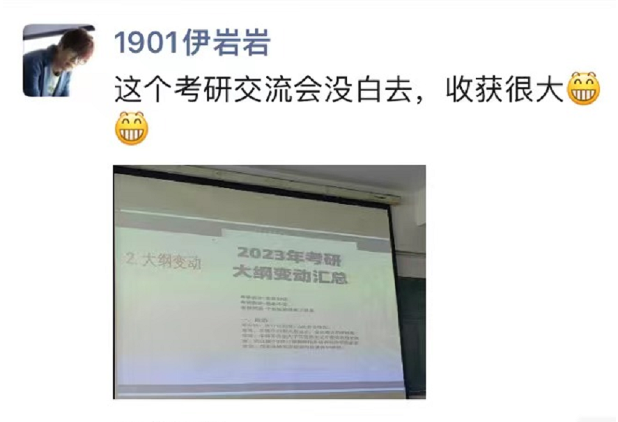 此次考研交流会的成功举办为英语系的学生鼓足了考研的干劲,激发了同学们的考研热情,坚定了同学们考研成功的信心,为同学们的考研备考注入了强劲动力。很多同学感慨“这个考研交流会没白去,收获很大”。