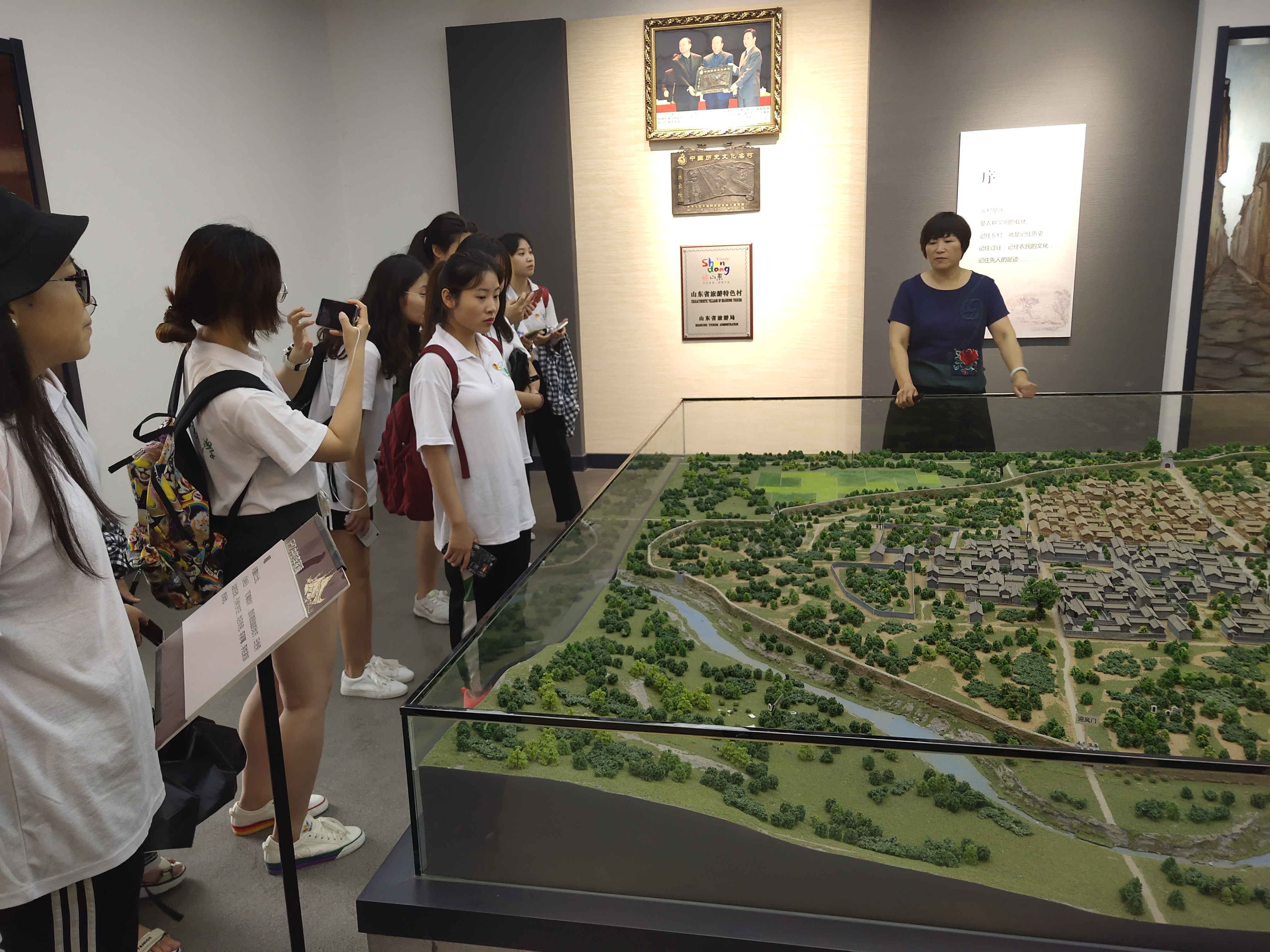 在博物馆工作人员的讲解下,一个乡镇的六百余年变迁与振兴的历史画卷呈现在同学们面前。博物馆中巨大的李家疃历史模型沙盘令人震撼,全长2452米的围墙包围着绿水青山和密集房屋。其中的“九门一庄、八门一府、四府一寺”最为著名,村中设施齐全,防御围墙和炮台等军事设施完备,蜿蜒的河道和神秘的地道纵横其间,布局合理,别具匠心。